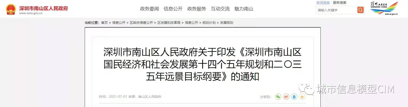 深圳南山区人民政府“十四五”规划:通过“GIS+BIM+CIM”融合应用,加快数字孪生云上城市和新型基础建设