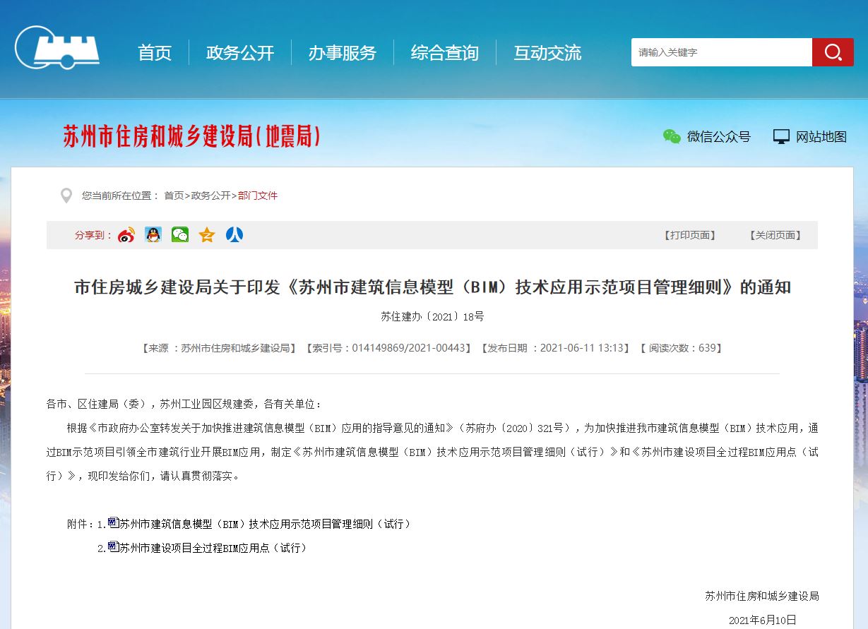 苏州市住房城乡建设局关于印发《苏州市建筑信息模型(BIM)技术应用示范项目管理细则》的通知